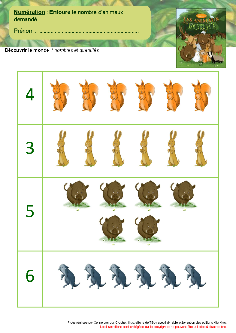 : 1) coller les animaux de la forêt - 2) entourer les animaux de la forêt - 3) sérier les animaux forêt/ferme/savane avec un code couleur |