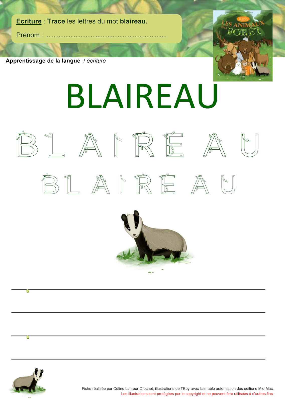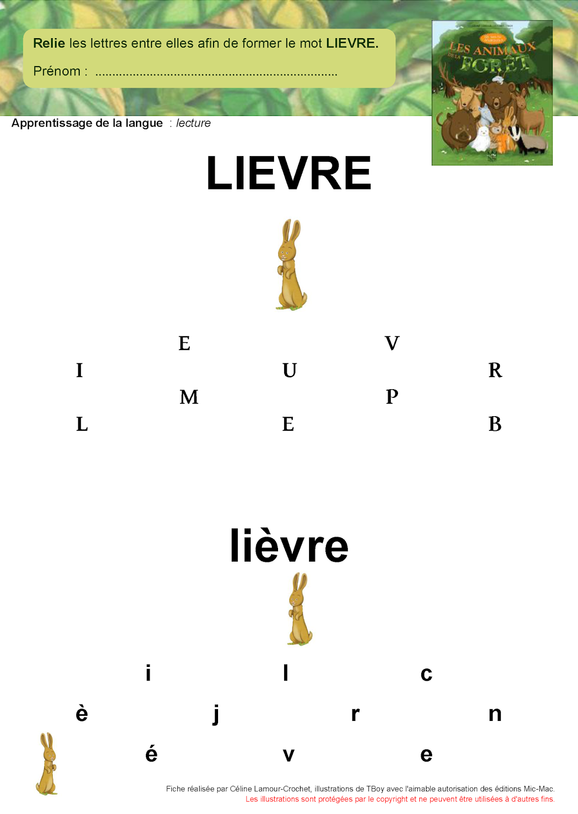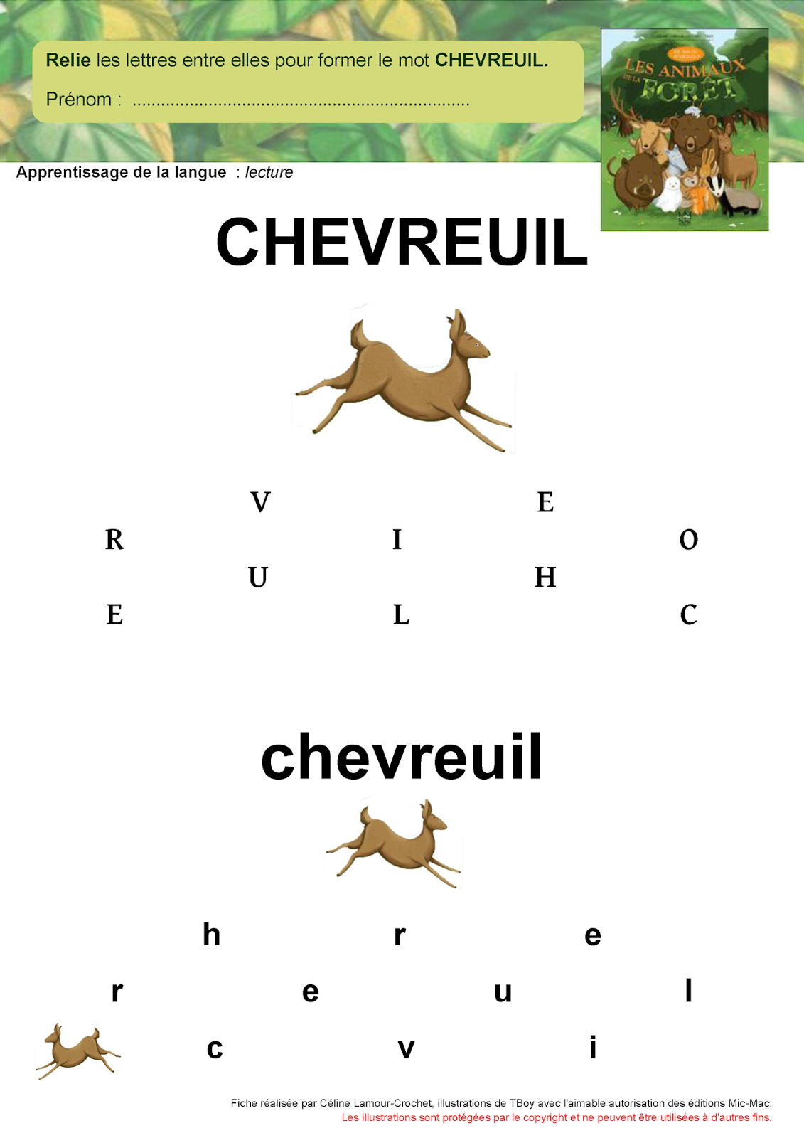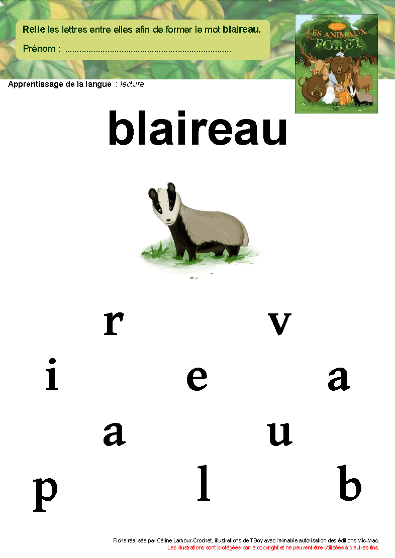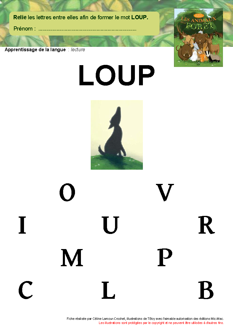 l'album principe alphabétique composer des mots en lettres curs. mobiles relier lettres fixes maj. et min. imp pour former chevreuil - écureuil - lièvre - loup - loir - sanglier |